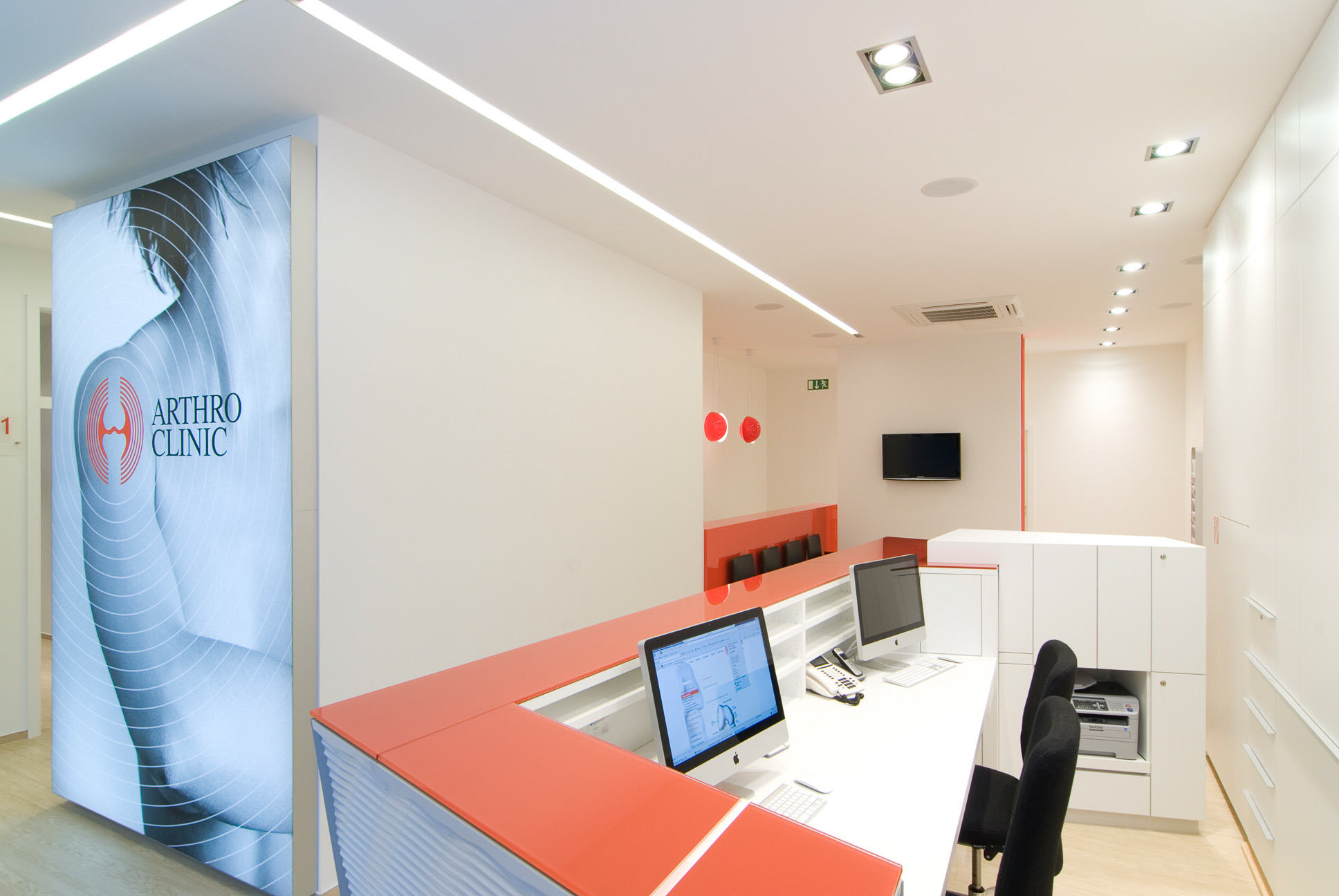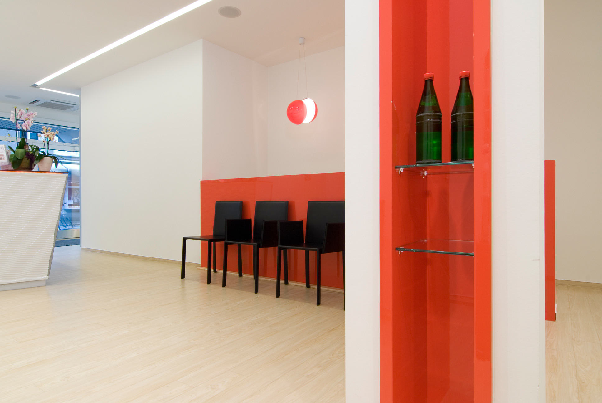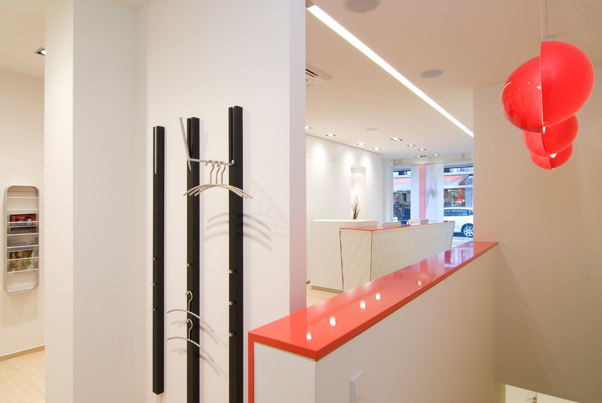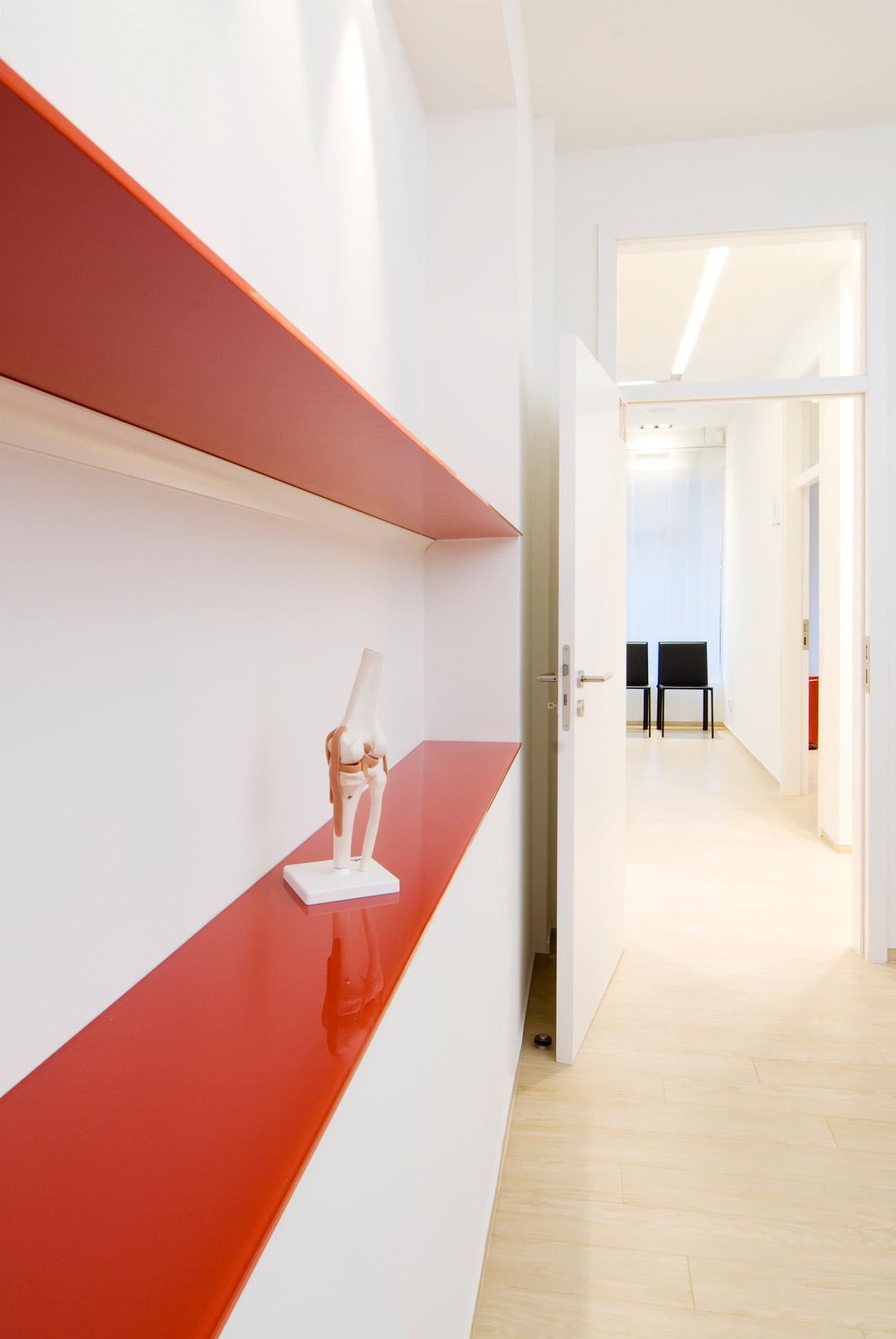 This new branch of practice, Arthro Clinic, shines fresh and bright in the centre of Bergedorf: 145sqm on two levels recieves the patients with a reduced and puristic choice of colours and forms, sculptural furniture and a homely floor. The CI colour runs like a proverbial red thread through the concept – down to the basement, enhancing also the functional spaces. A flush mounted strip light commuicates between the public areas and reception, waiting area, toilet and the three discreetly arranged accesses to the treatment rooms. In the centre there is a ceiling high illuminated image of a body, which is publicity for the interior and exterior.