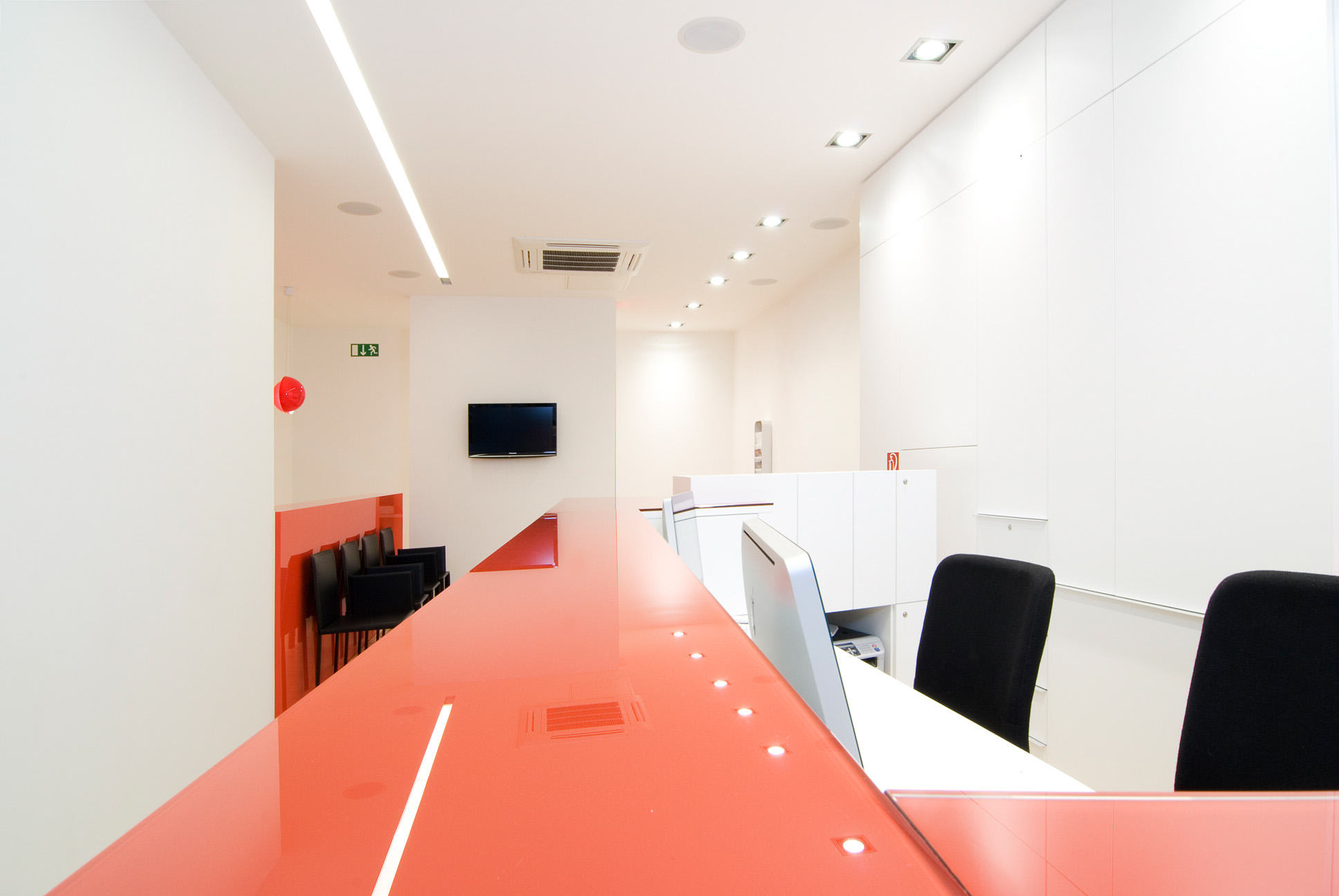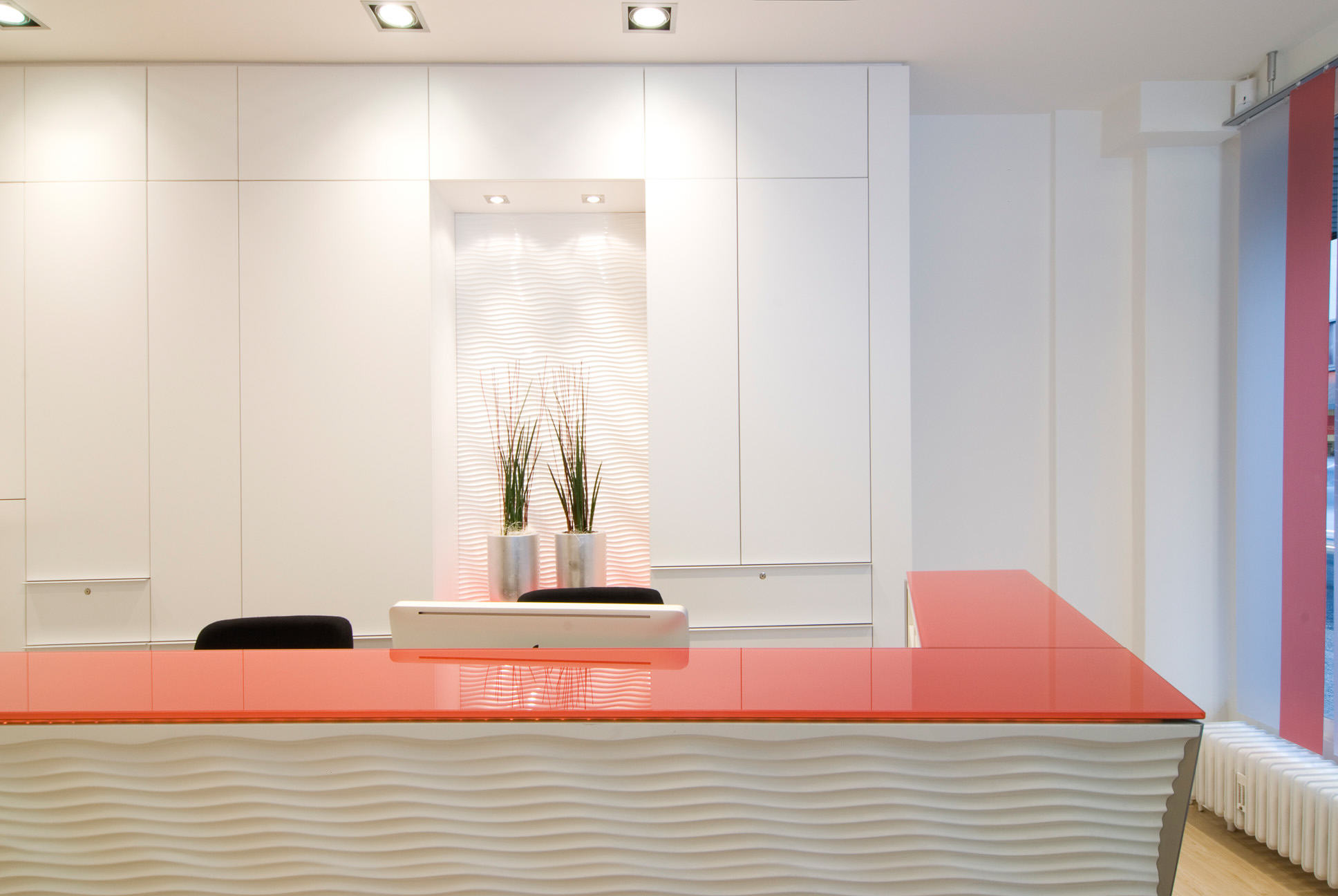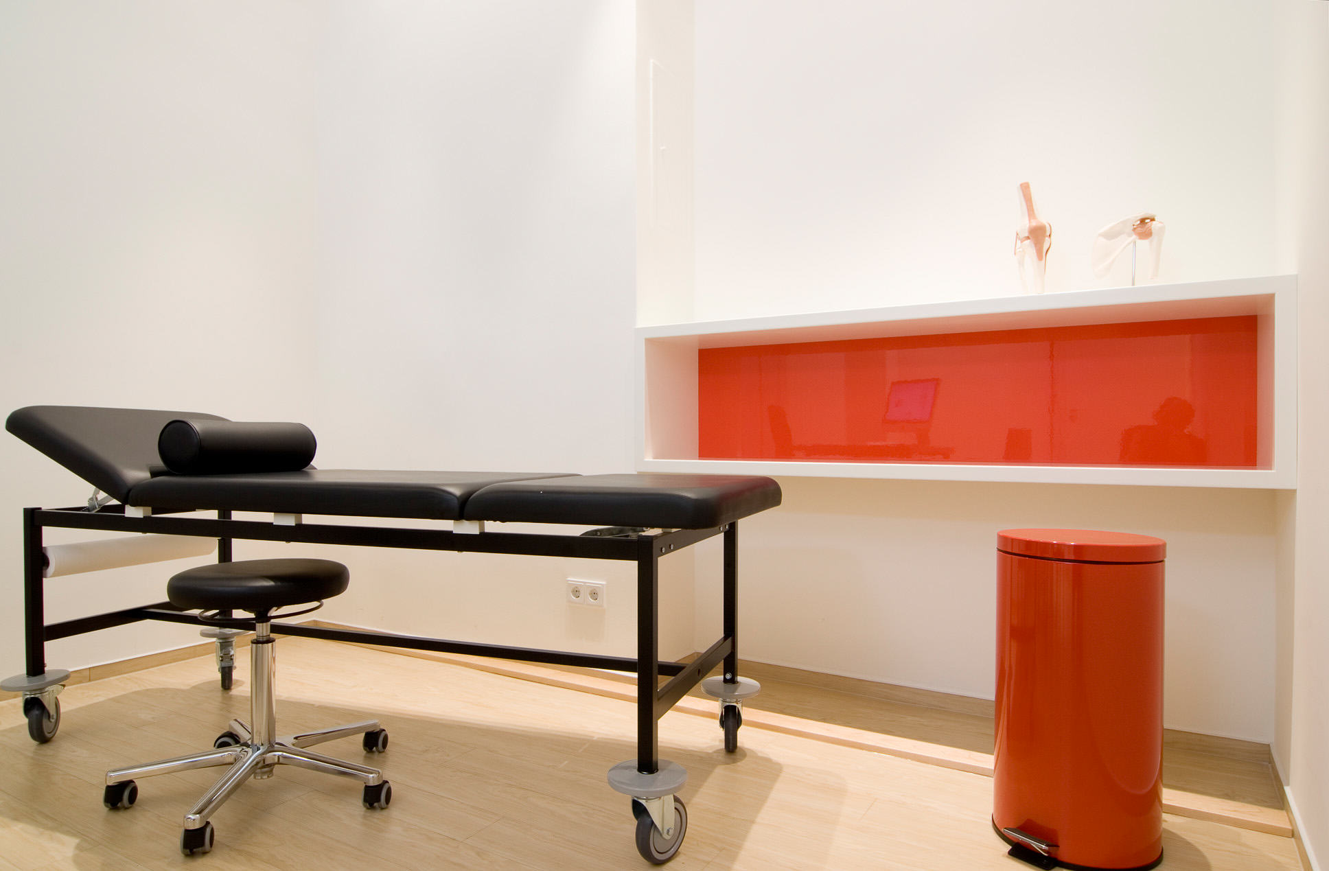 This new branch of practice, Arthro Clinic, shines fresh and bright in the centre of Bergedorf: 145sqm on two levels recieves the patients with a reduced and puristic choice of colours and forms, sculptural furniture and a homely floor. The CI colour runs like a proverbial red thread through the concept – down to the basement, enhancing also the functional spaces. A flush mounted strip light commuicates between the public areas and reception, waiting area, toilet and the three discreetly arranged accesses to the treatment rooms. In the centre there is a ceiling high illuminated image of a body, which is publicity for the interior and exterior.