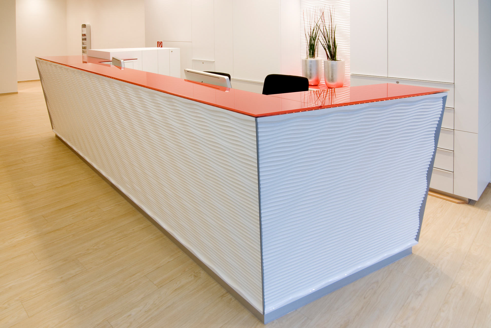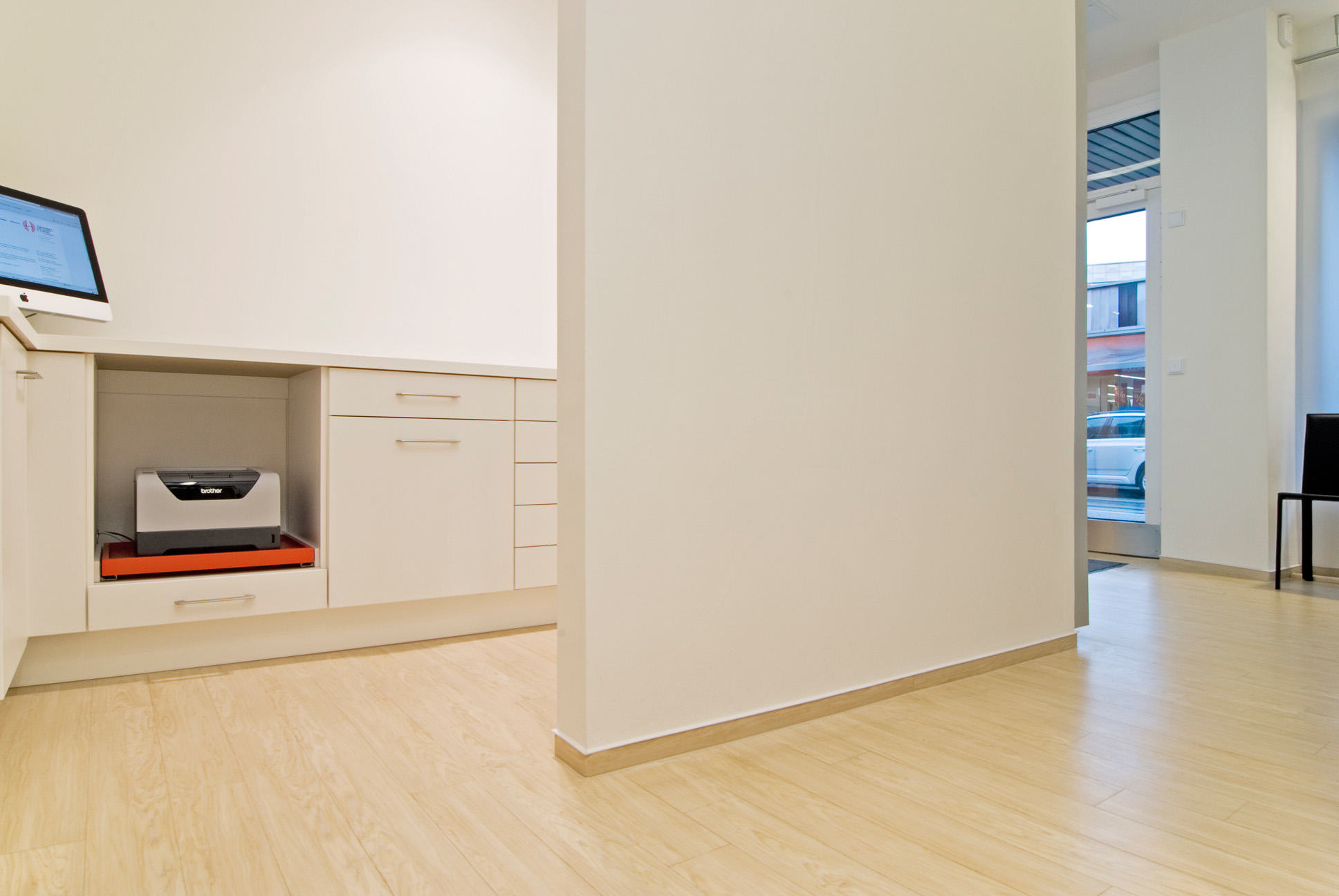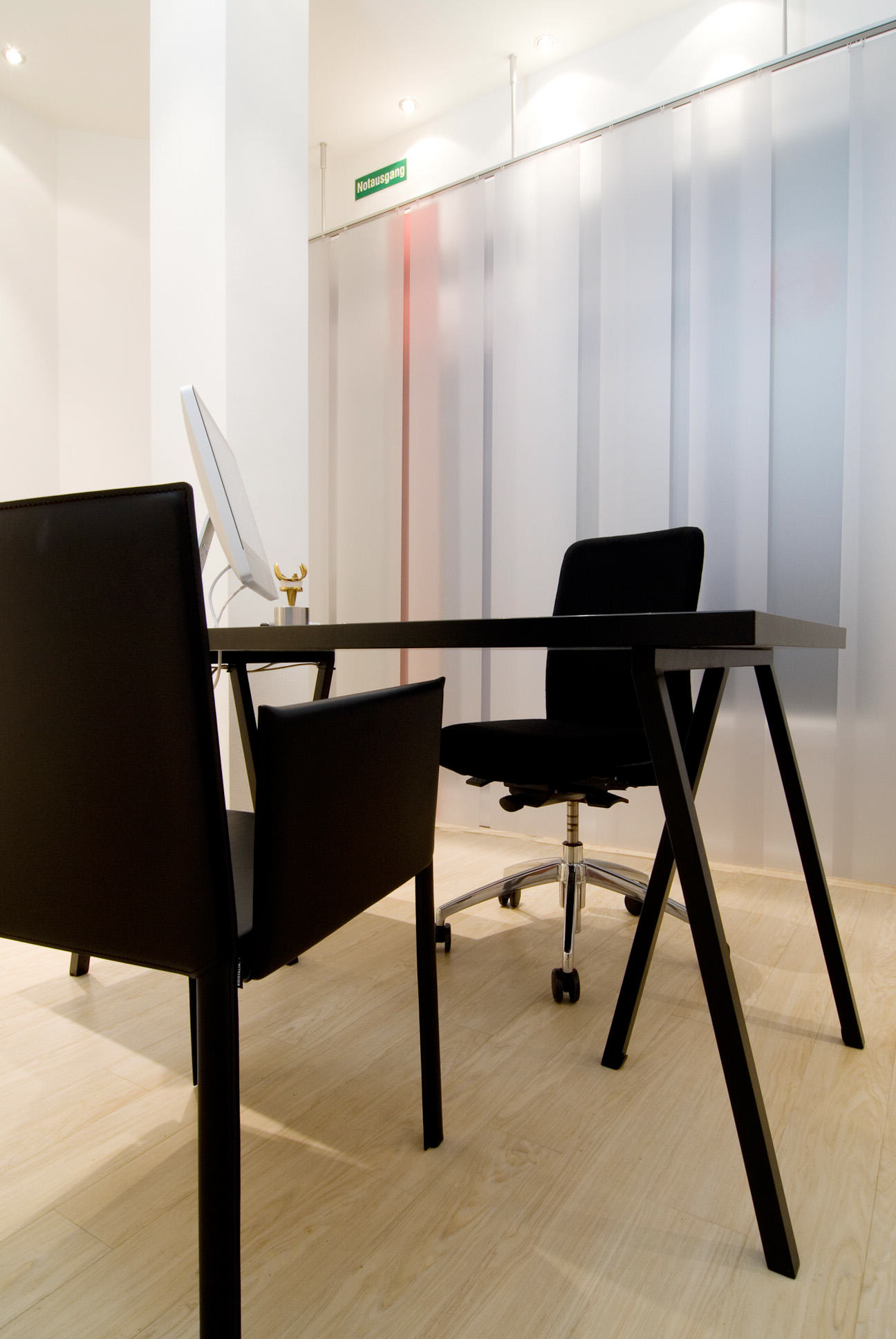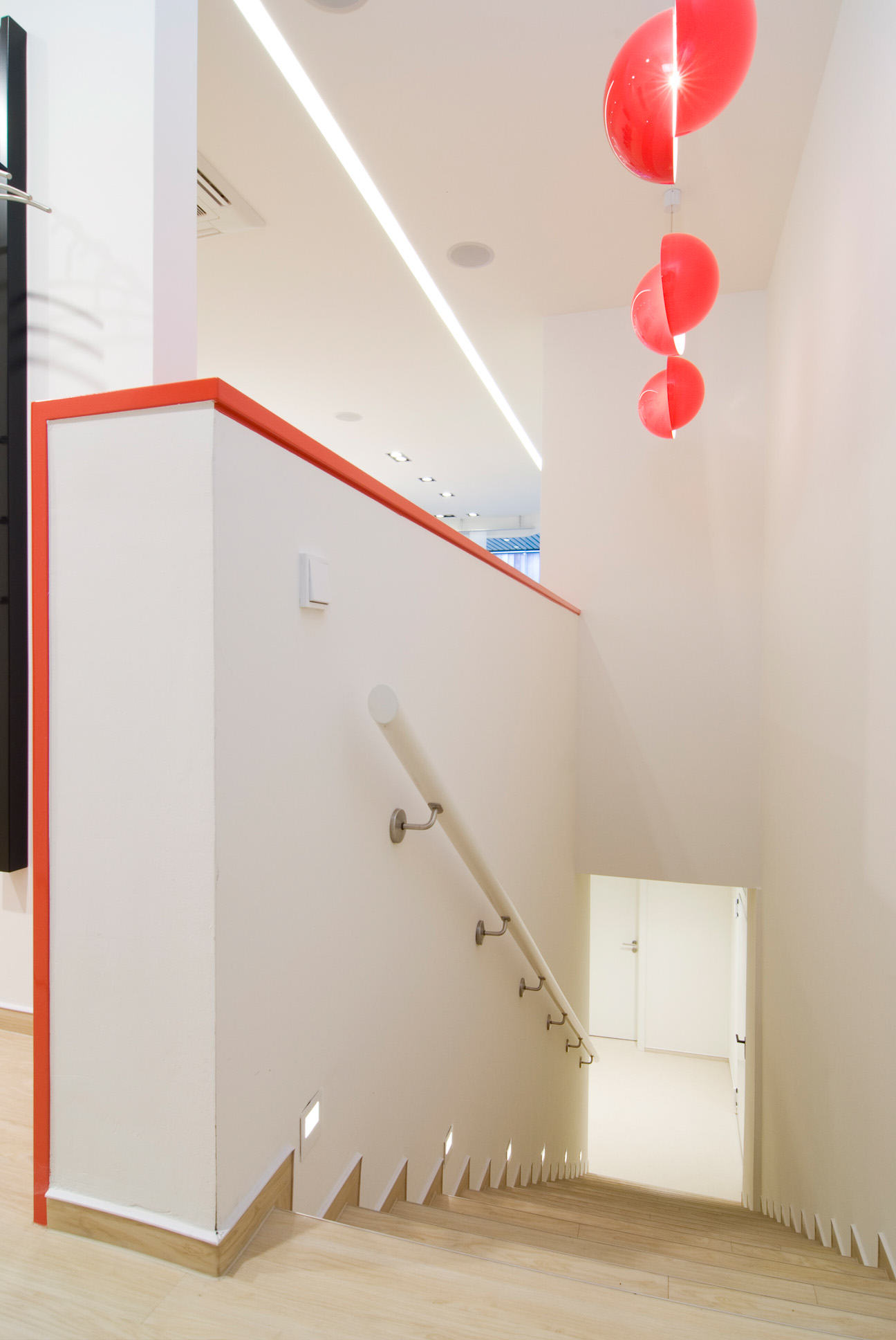 This new branch of practice, Arthro Clinic, shines fresh and bright in the centre of Bergedorf: 145sqm on two levels recieves the patients with a reduced and puristic choice of colours and forms, sculptural furniture and a homely floor. The CI colour runs like a proverbial red thread through the concept – down to the basement, enhancing also the functional spaces. A flush mounted strip light commuicates between the public areas and reception, waiting area, toilet and the three discreetly arranged accesses to the treatment rooms. In the centre there is a ceiling high illuminated image of a body, which is publicity for the interior and exterior.